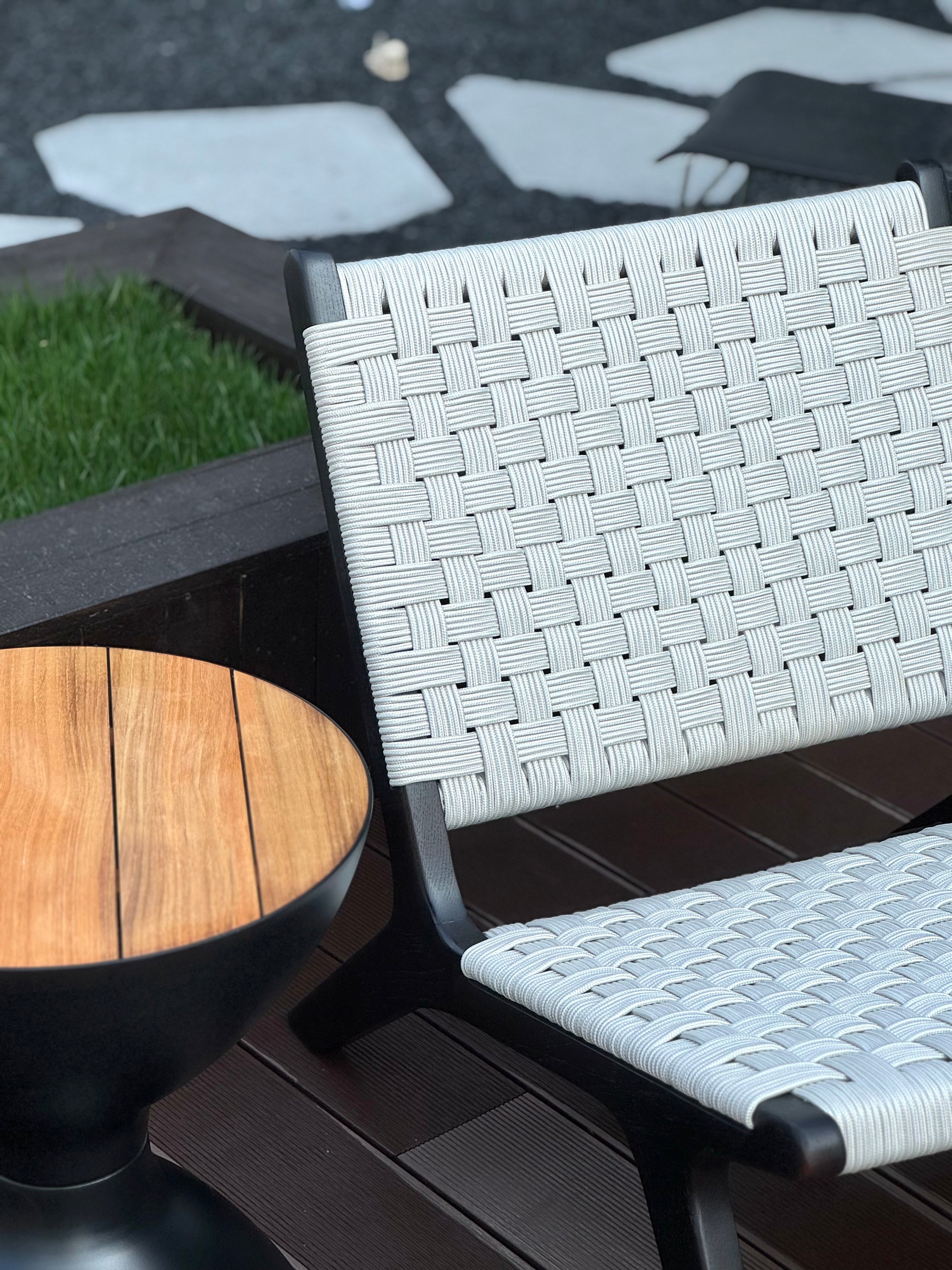 The stainless steel frame creates a modern silhouette with architectural geometric lines. The hand-woven grey rope net forms a transparent backrest, which is matched with high-density waterproof cushions to achieve a balance between rigidity and flexibility.