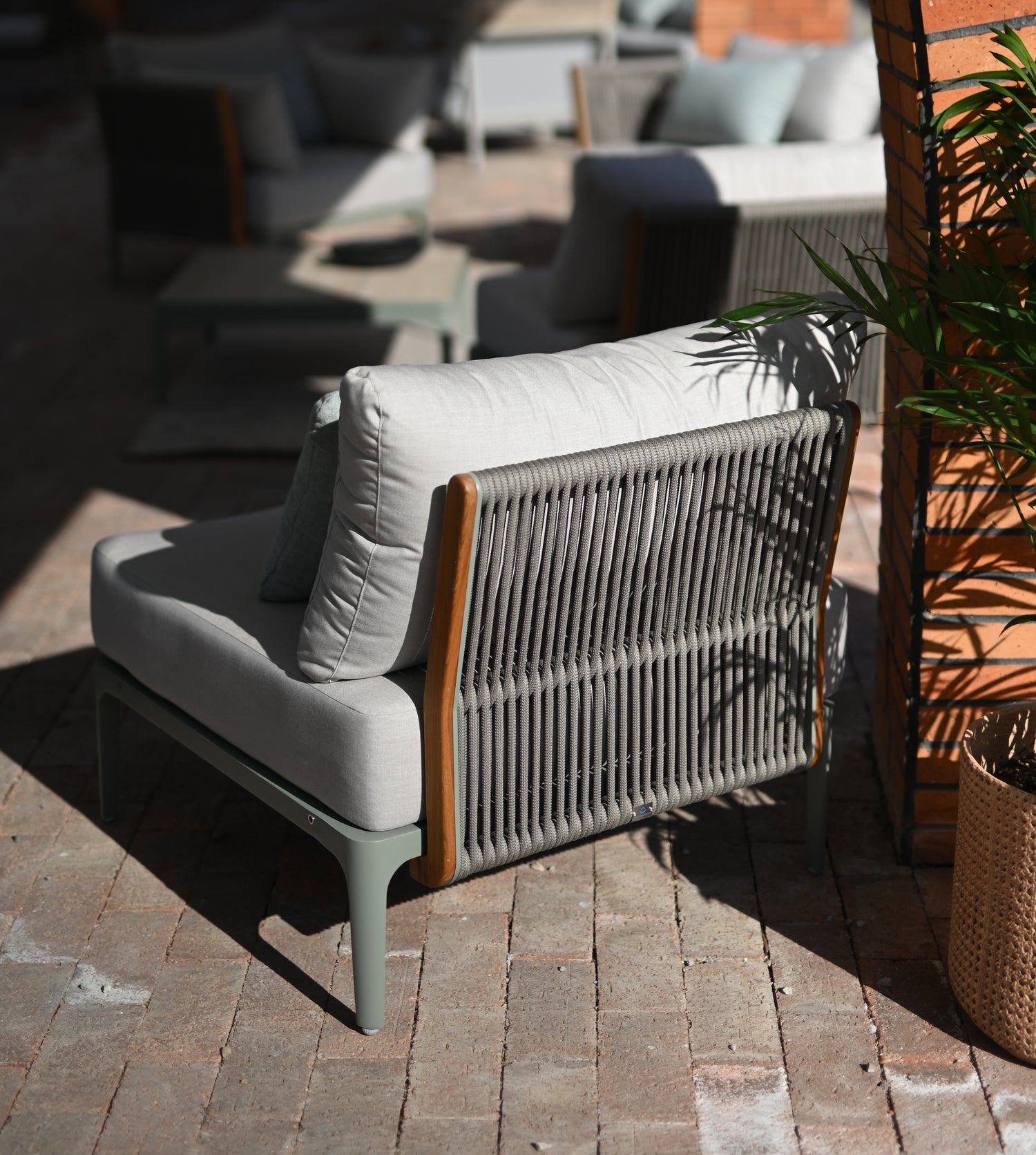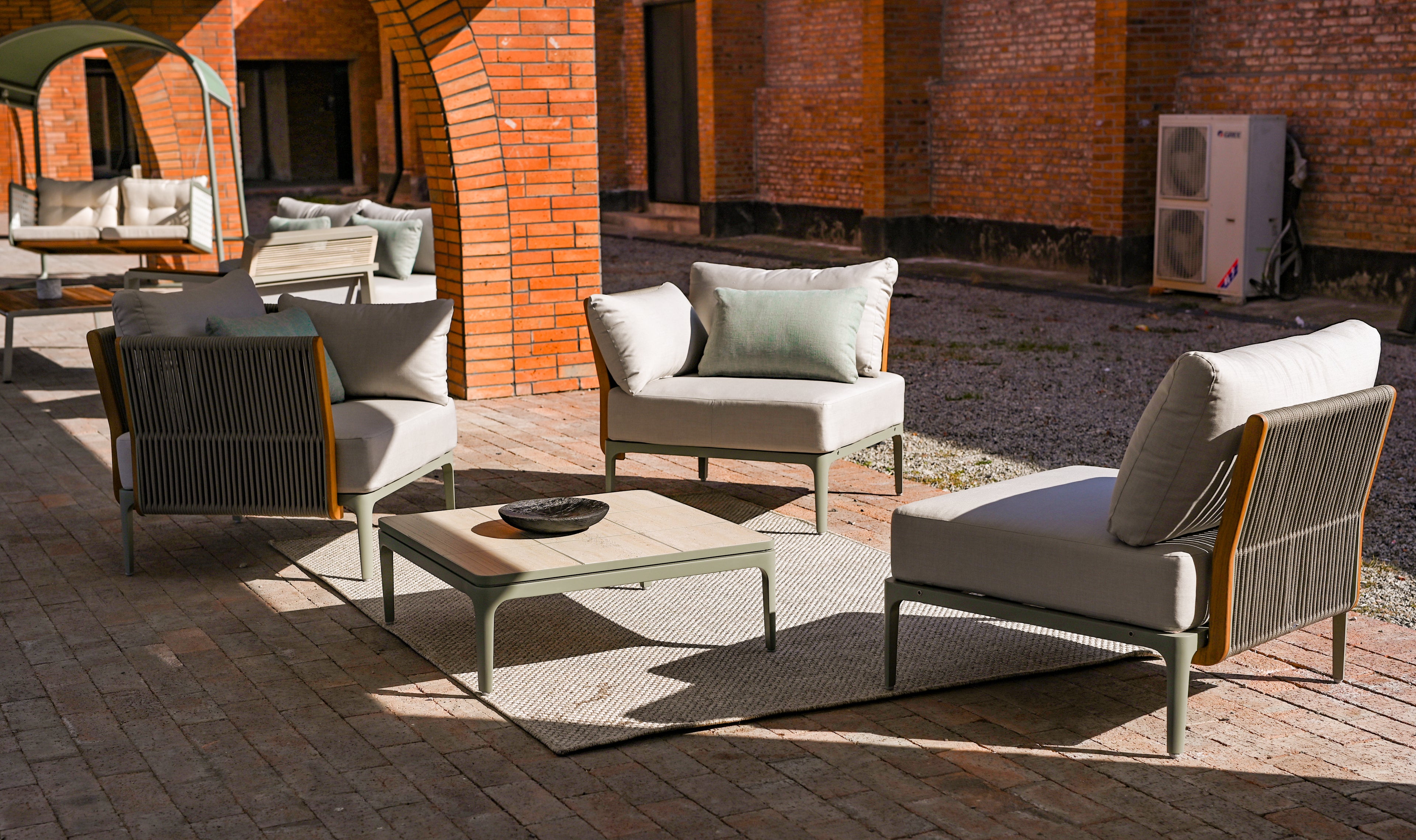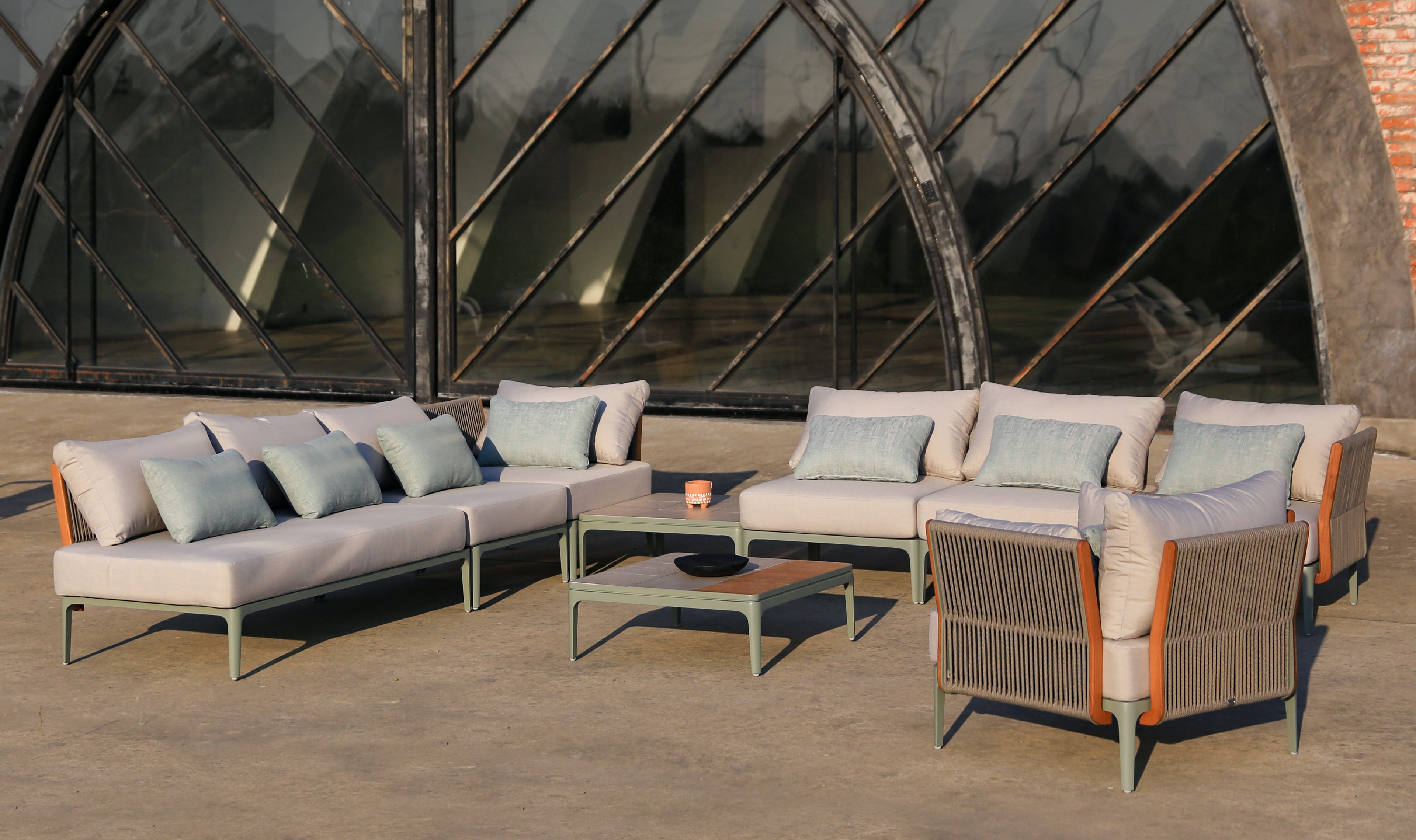 The Albert Series is characterized by its sleek lines, clean shapes, and minimalist aesthetic. Each piece in the series features an aluminum alloy frame as the base, complemented by Olefin core rope weaving for the backrests and side panels. The use of teakwood frames adds warmth and texture to the overall design, creating a harmonious blend of modernity and natural elements.