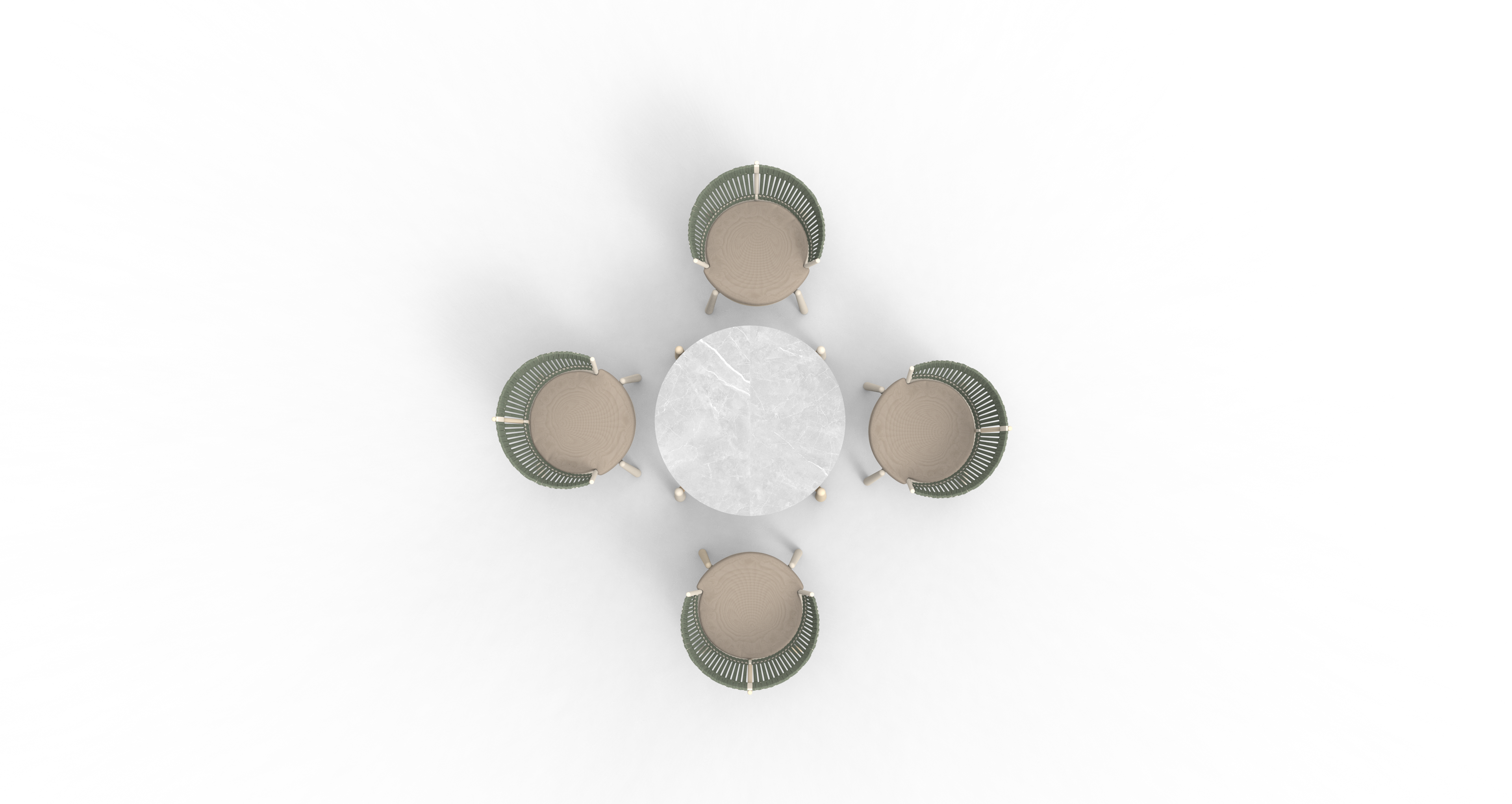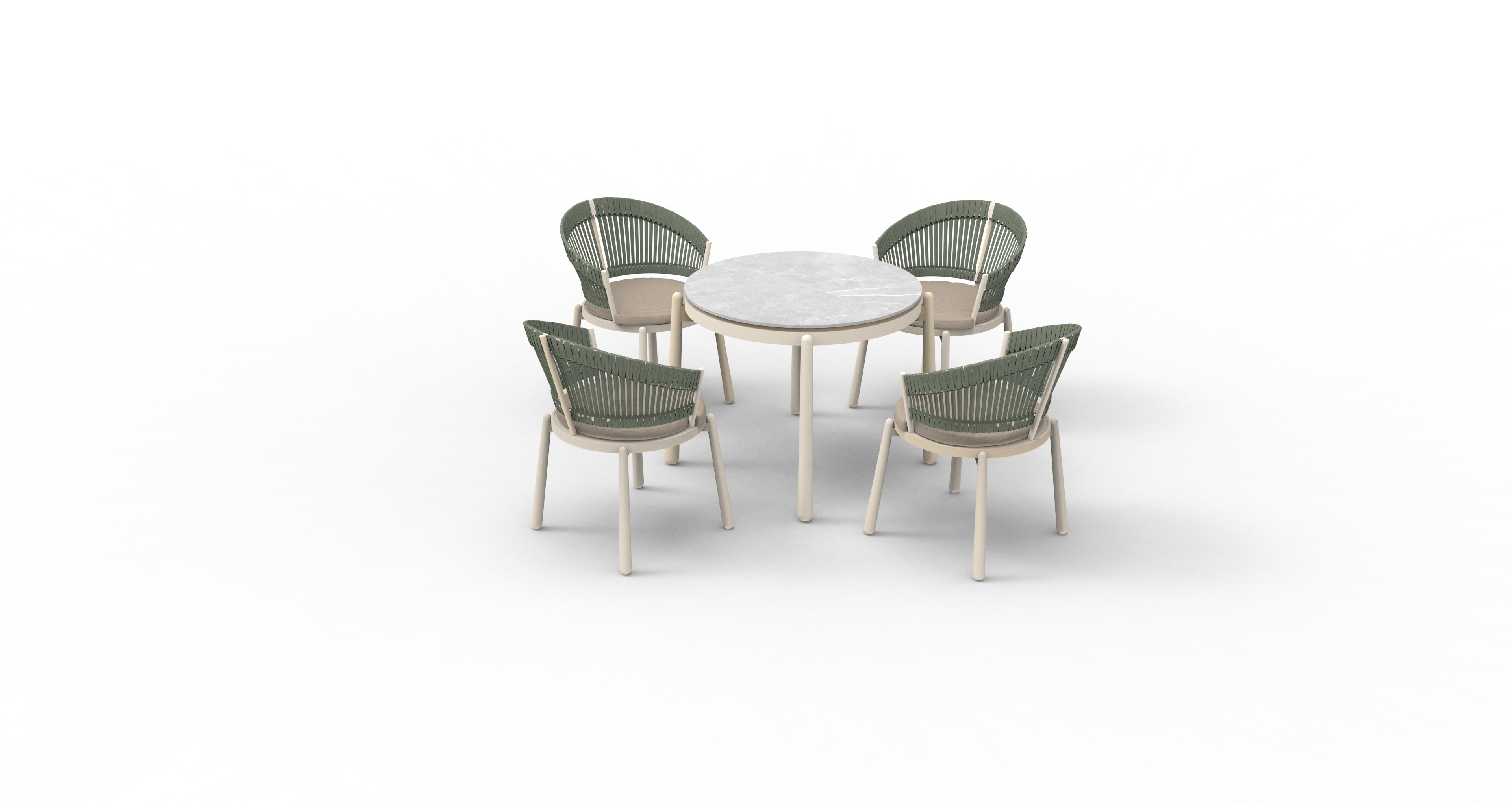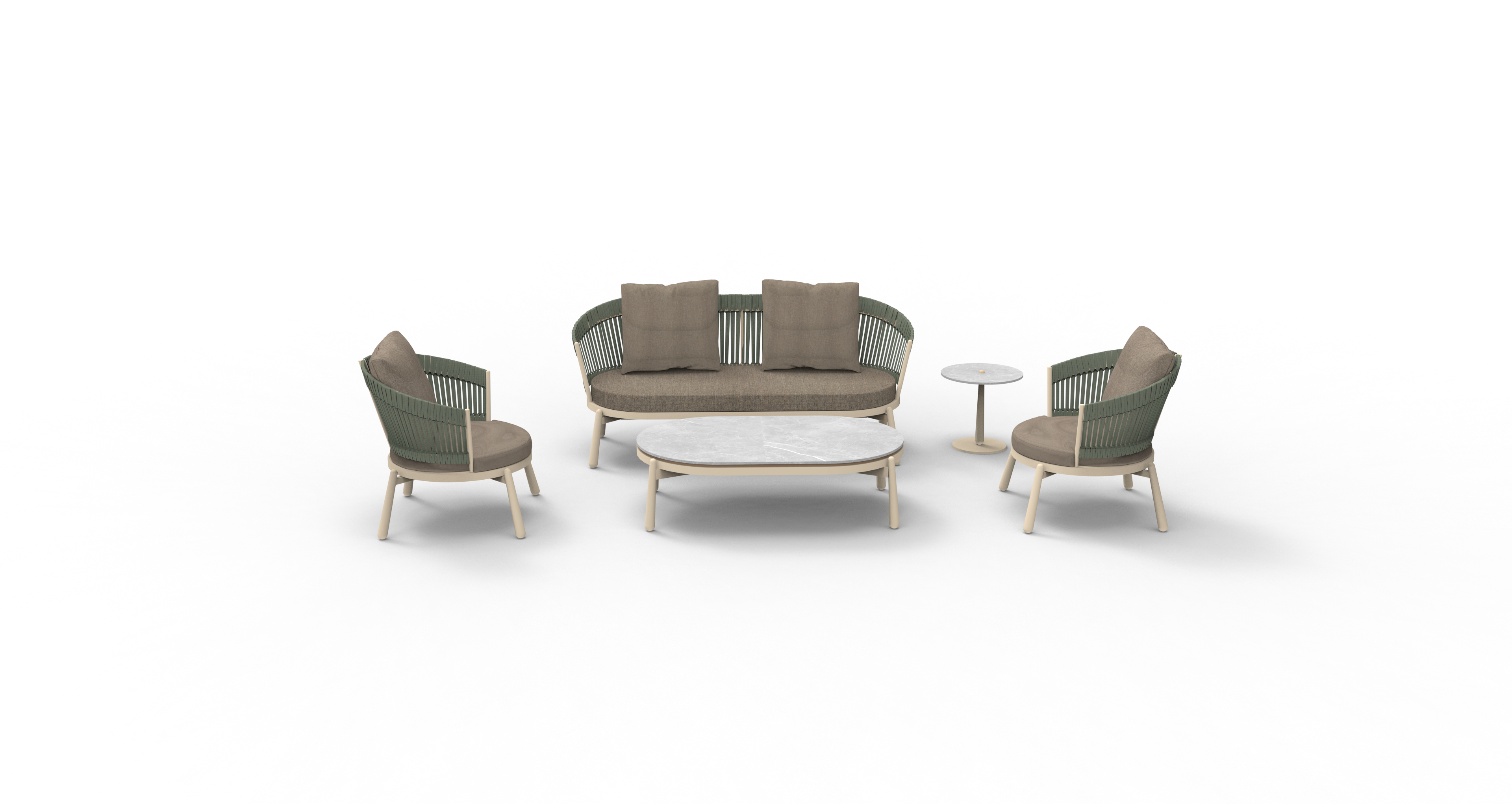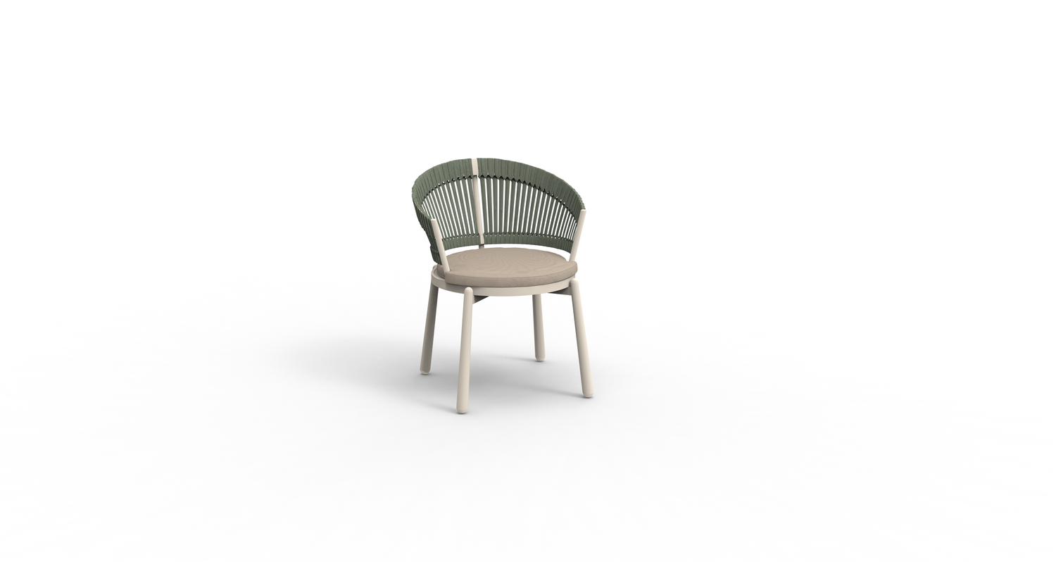 The dining and lounge chairs are available with an upgraded swivel base option, enhancing flexibility and interaction in social spaces. The backrests feature woven straps that offer a breathable, visually dynamic structure, while plush cushions provide a sense of enveloping comfort without compromising ventilation.