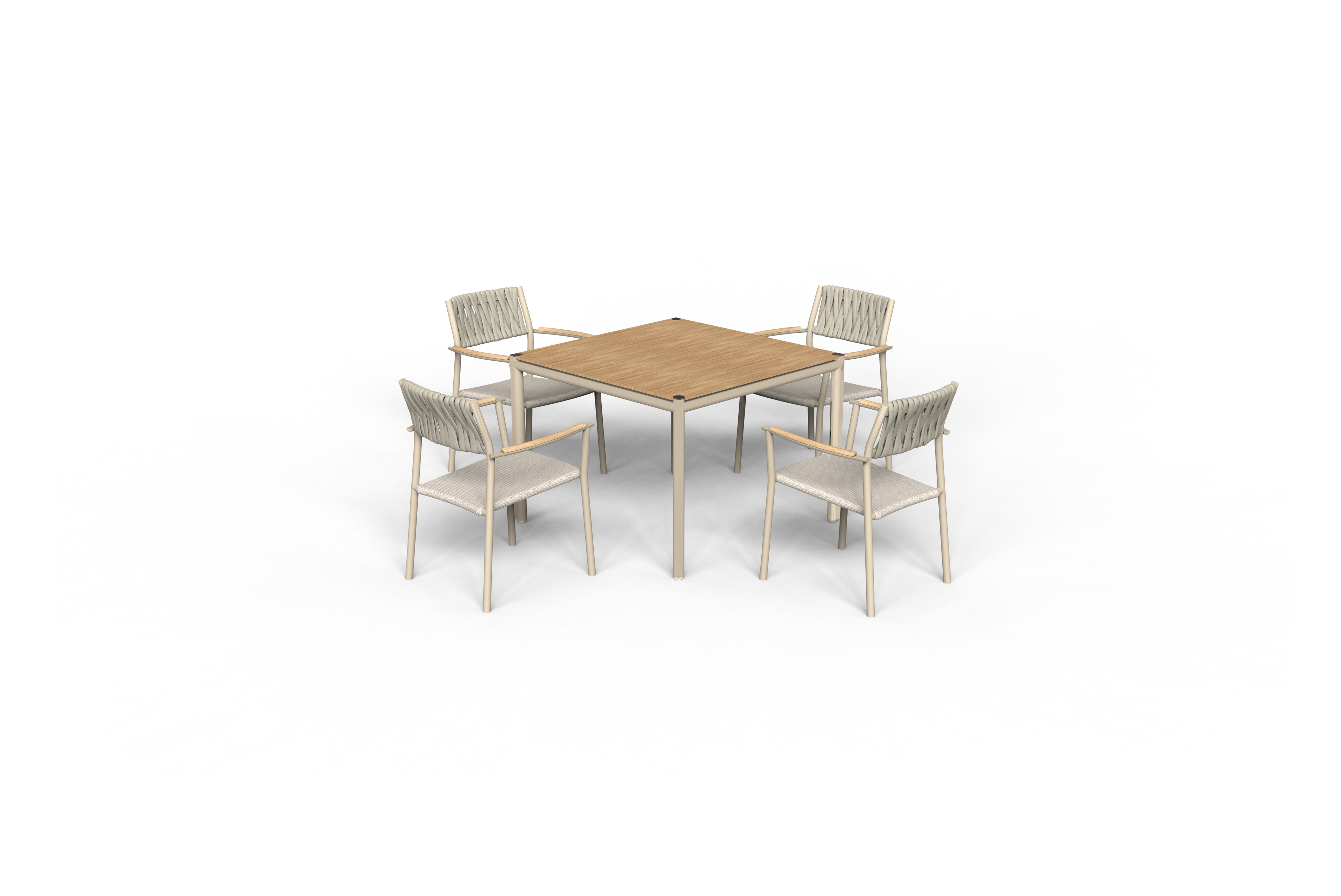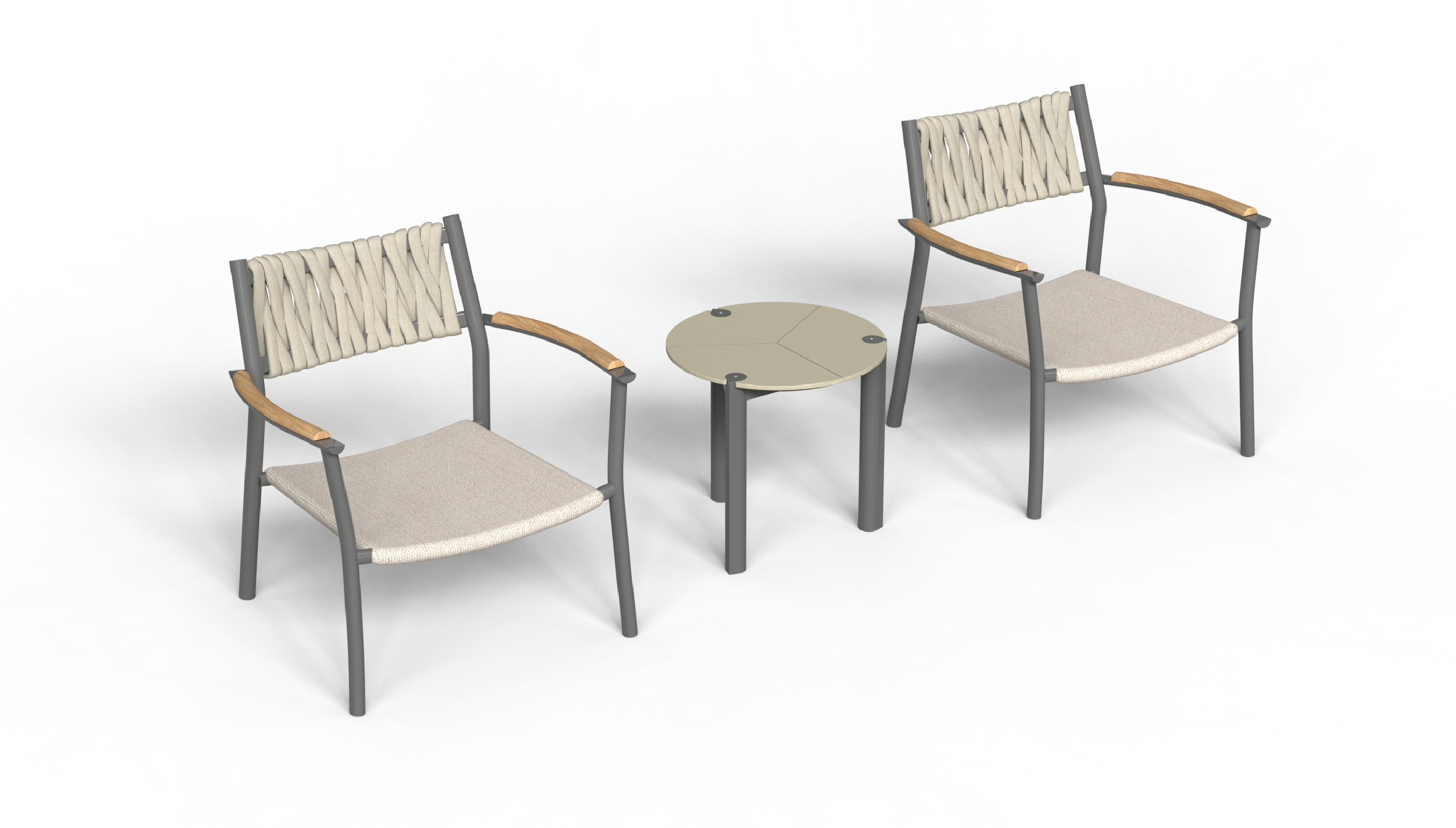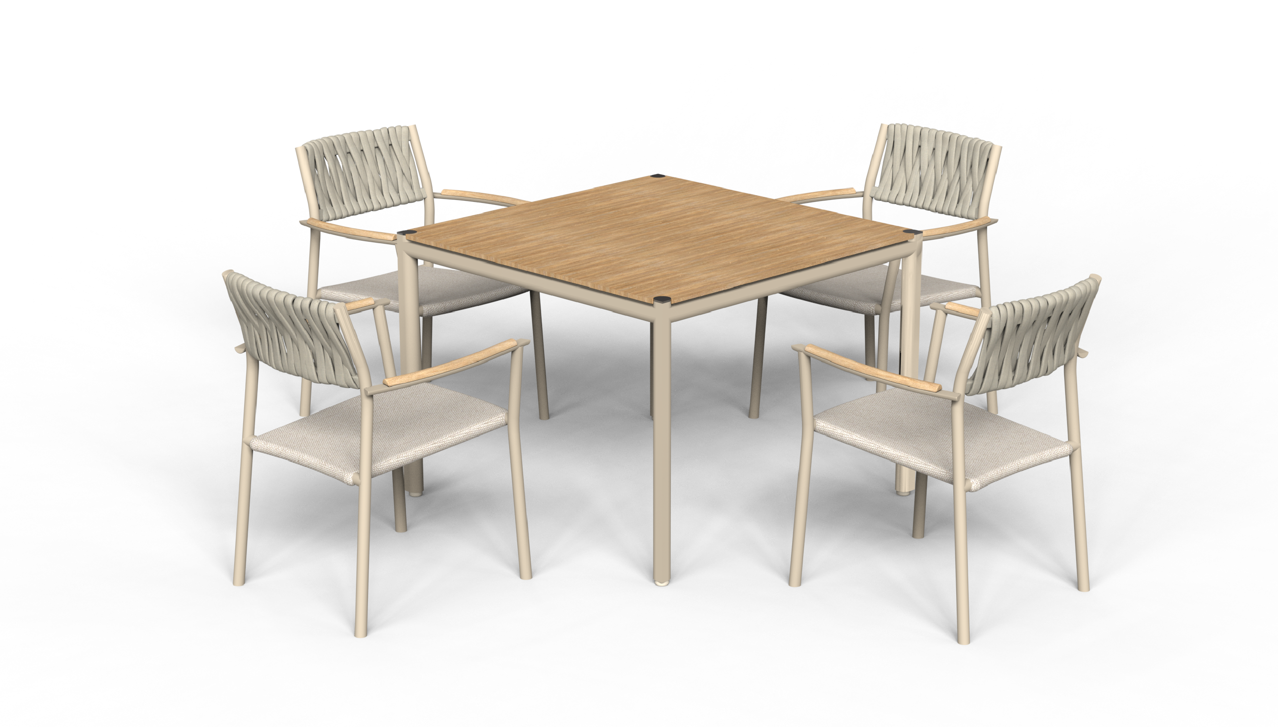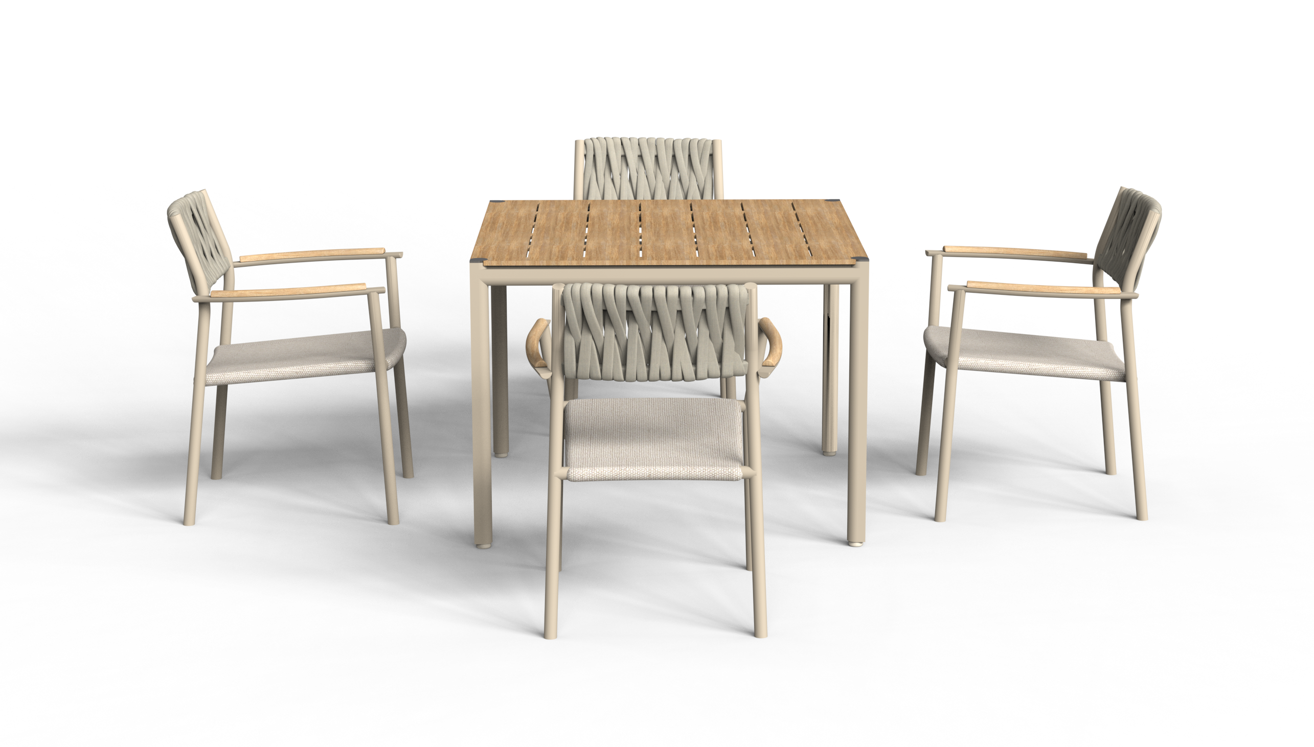the Cleo Series offers a modern interpretation of outdoor furniture, combining sleek design elements with thoughtful details to create a stylish and versatile collection. With itsteakwood armrests, twisted arm design, and contempo- rary aesthetic, the Cleo Series is sure to elevate any outdoor or indoor space with its unique charm and sophistication.