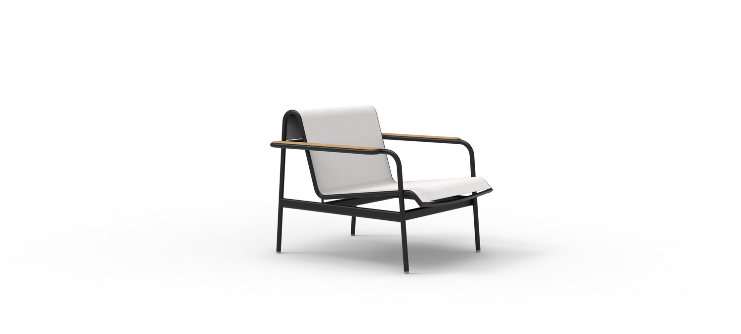 The overall structure is primarily made of aluminum alloy framework, complemented by a single-piece Teslin back panel, presenting a clean yet integrated appearance. Embedded with Burmese teak panels at the armrests, it serves both as a handrail and a convenient surface for placing cups, phones, and other personal items.