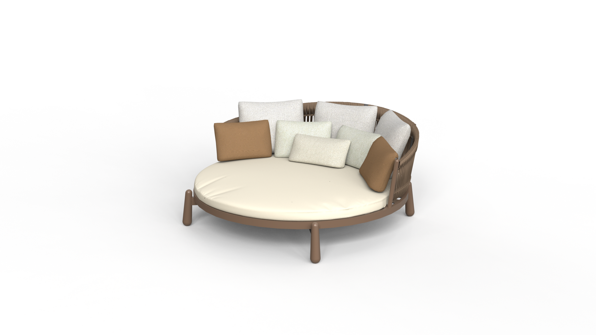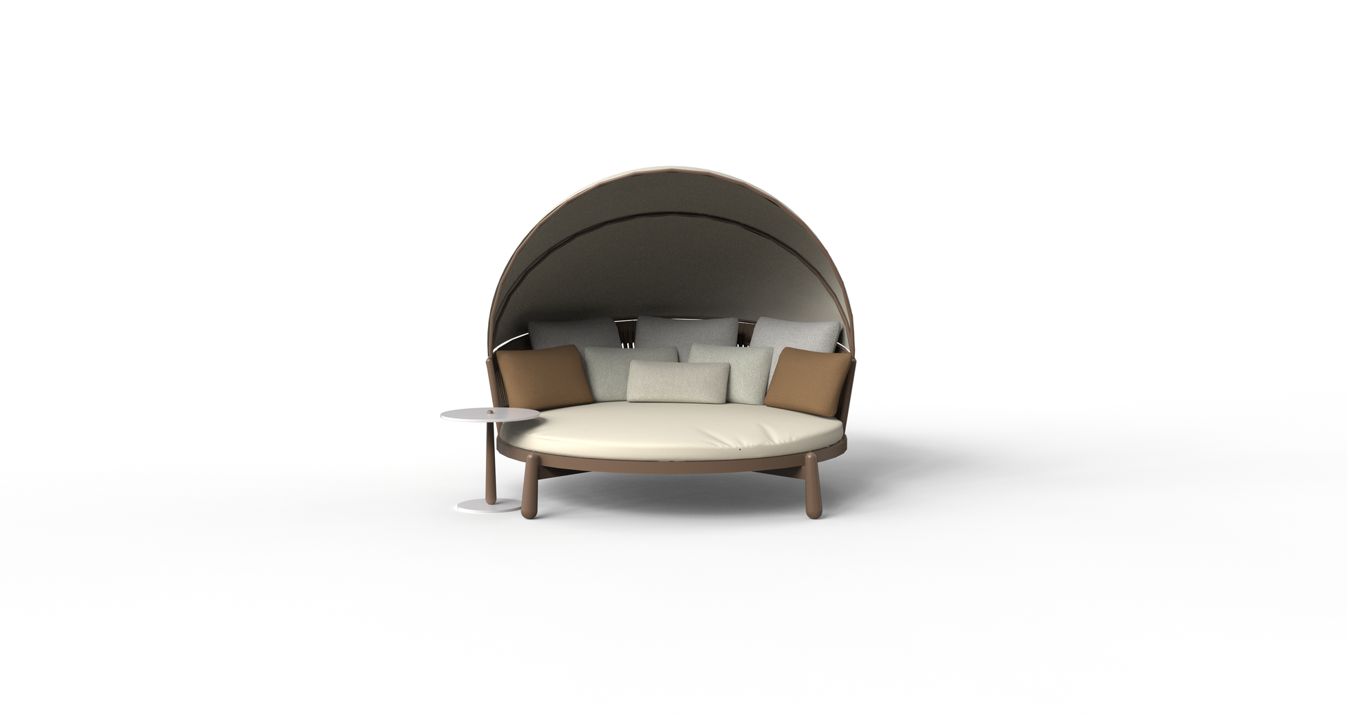 The base and legs of the furniture can be customized with teak wood, adding a layer of natural warmth and tactile richness to the overall design. The daybed, designed with an adjustable canopy, offers a shaded, resort-like experience that’s perfect for lounging by the pool.
