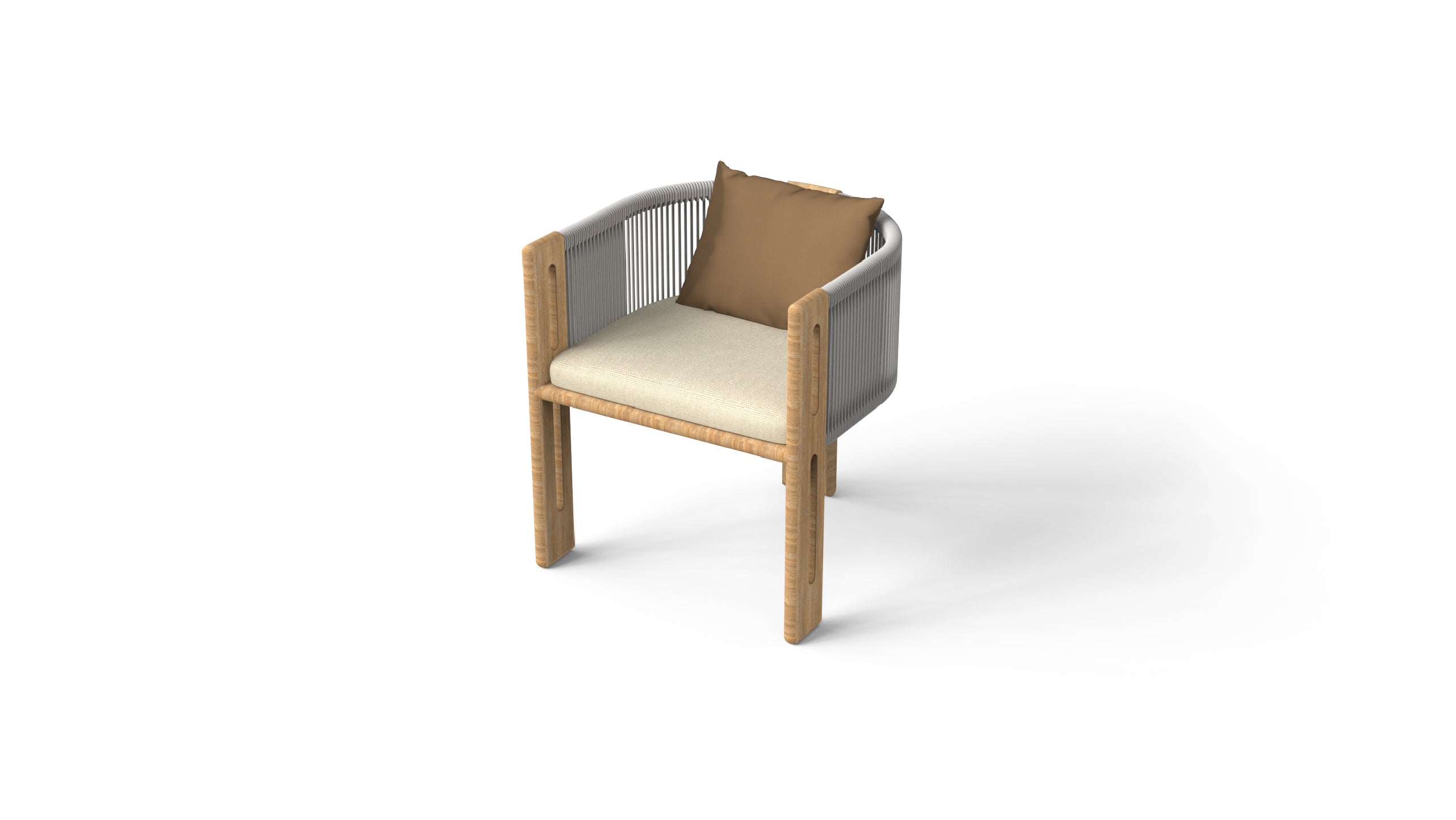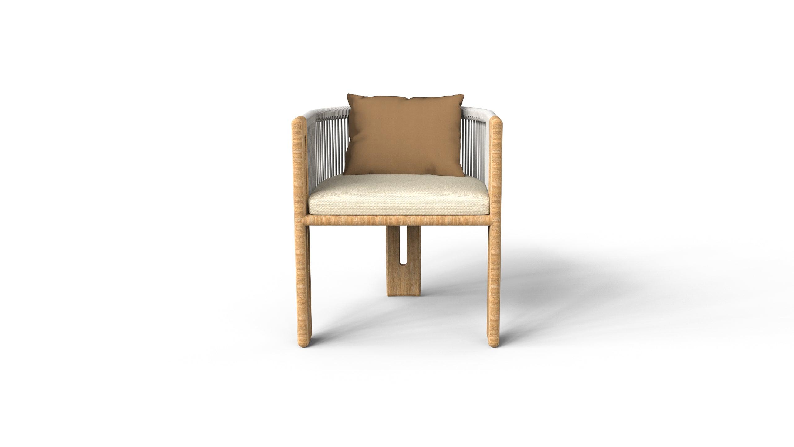 Generously cushioned seating provides a luxurious level of comfort, while the use of natural travertine stone introduces a timeless, earthy sophistication. The addition of round rope weaving adds a breezy, open feel, enhancing the collection’s outdoor character and sense of lightness.
