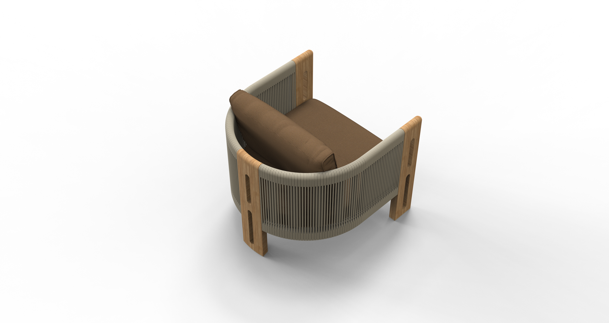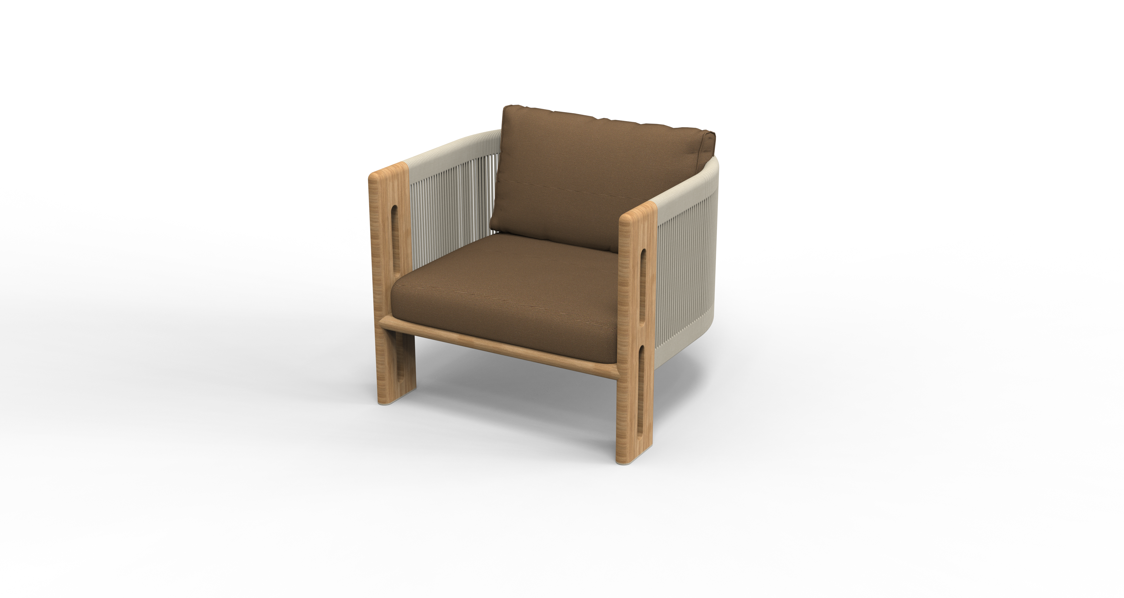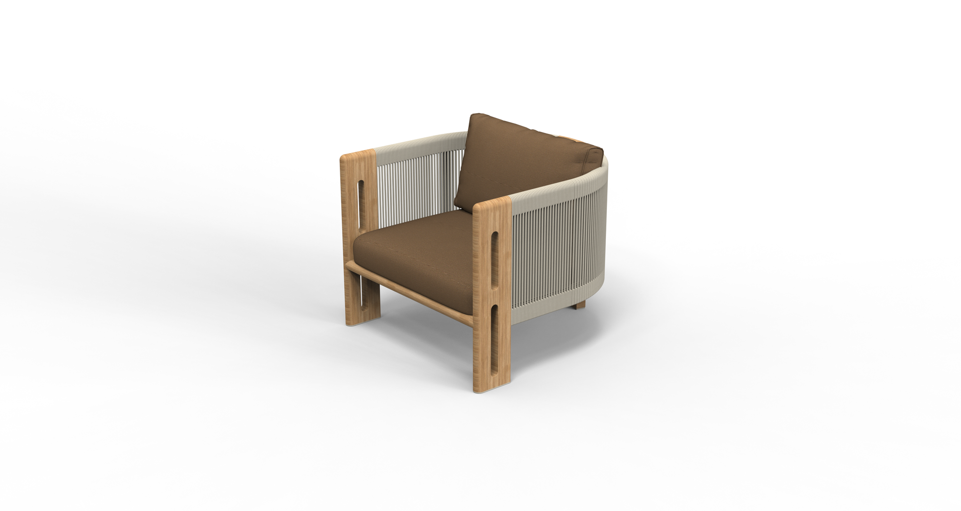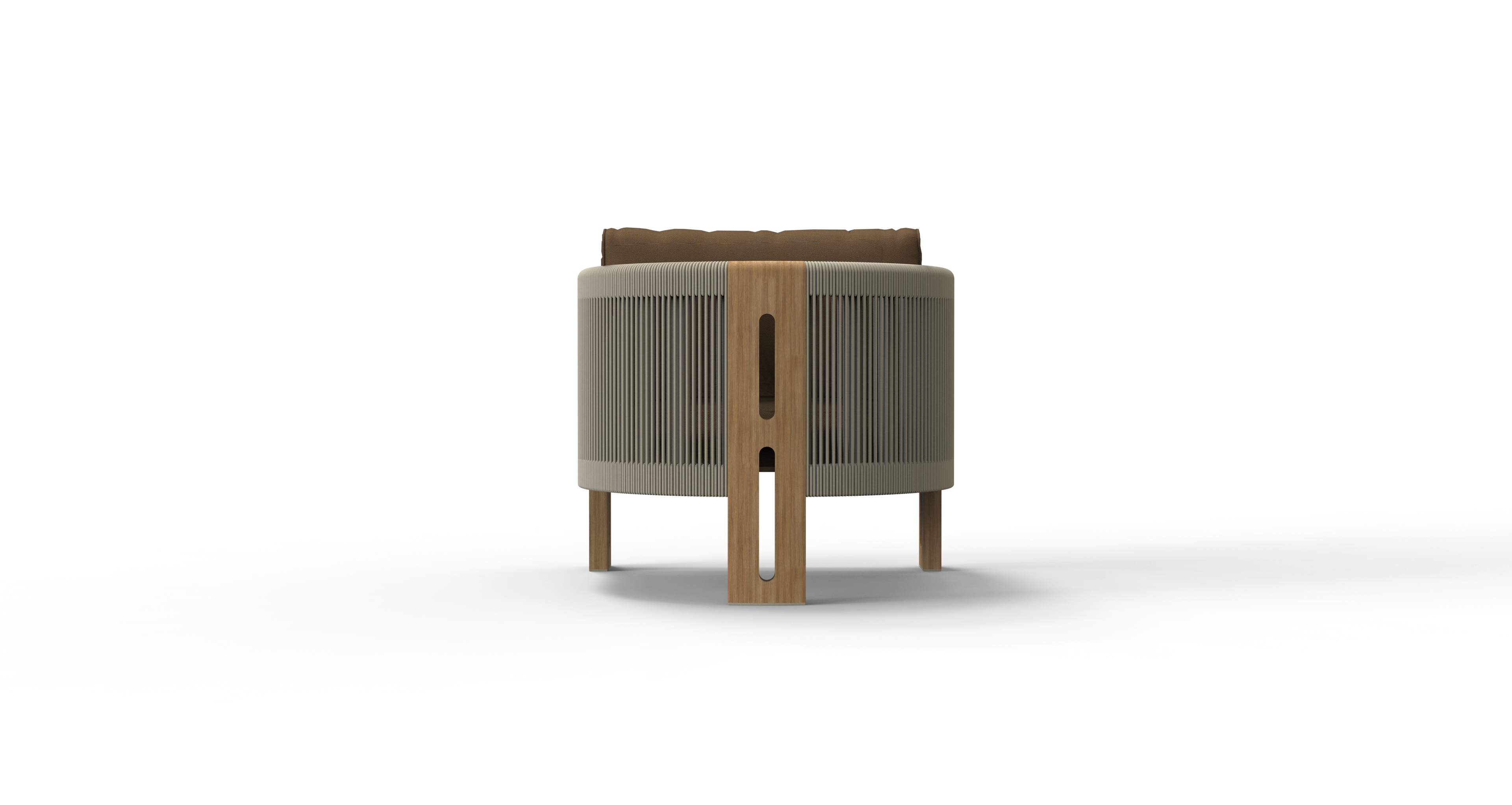 Generously cushioned seating provides a luxurious level of comfort, while the use of natural travertine stone introduces a timeless, earthy sophistication. The addition of round rope weaving adds a breezy, open feel, enhancing the collection’s outdoor character and sense of lightness.