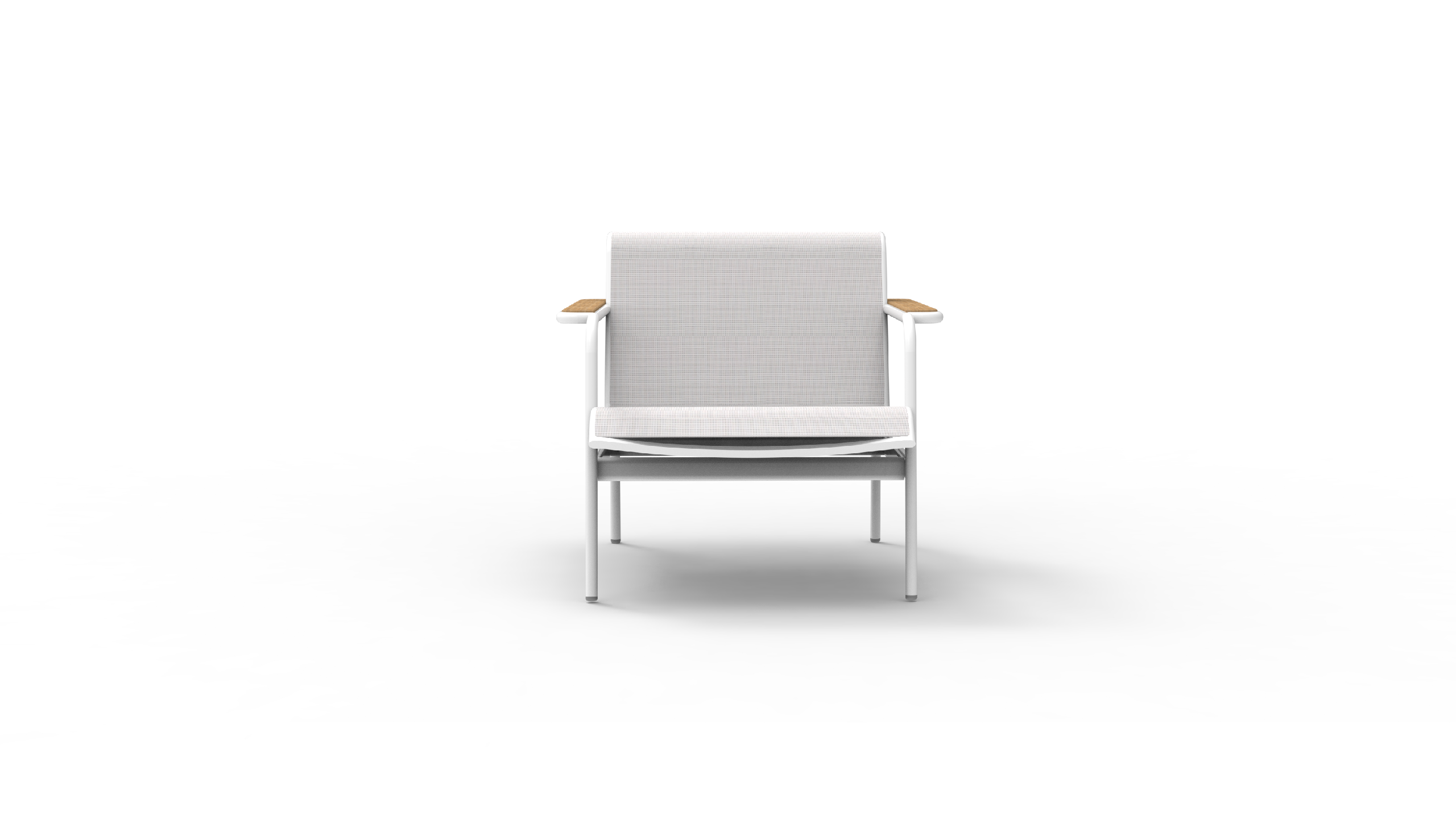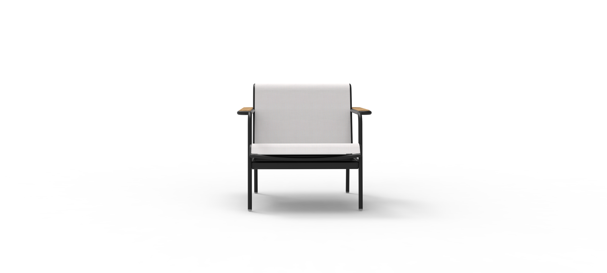 The overall structure is primarily made of aluminum alloy framework, complemented by a single-piece Teslin back panel, presenting a clean yet integrated appearance. Embedded with Burmese teak panels at the armrests, it serves both as a handrail and a convenient surface for placing cups, phones, and other personal items.