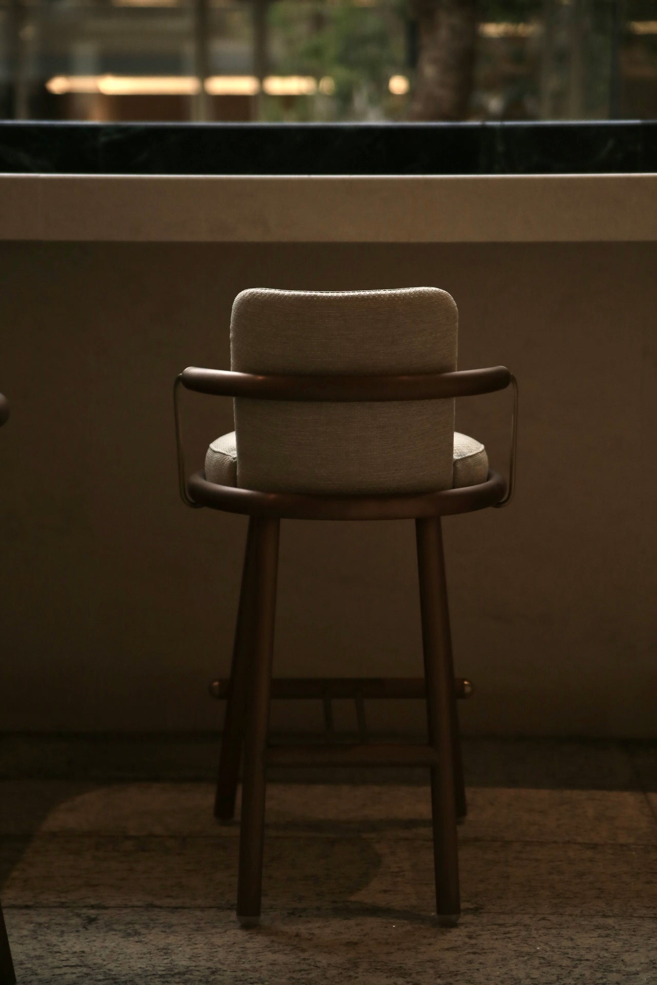 清晨推开窗外,黄昏降临,可移动的落地灯在实木高脚凳周围散发出暖黄色的光晕,仿佛月亮的影子在栏杆上移动。