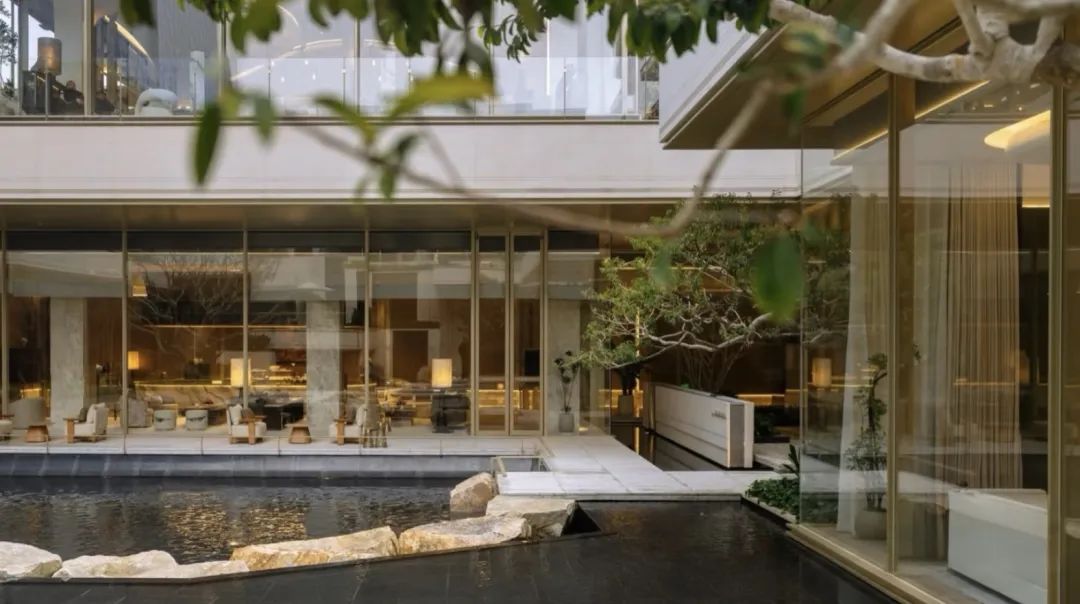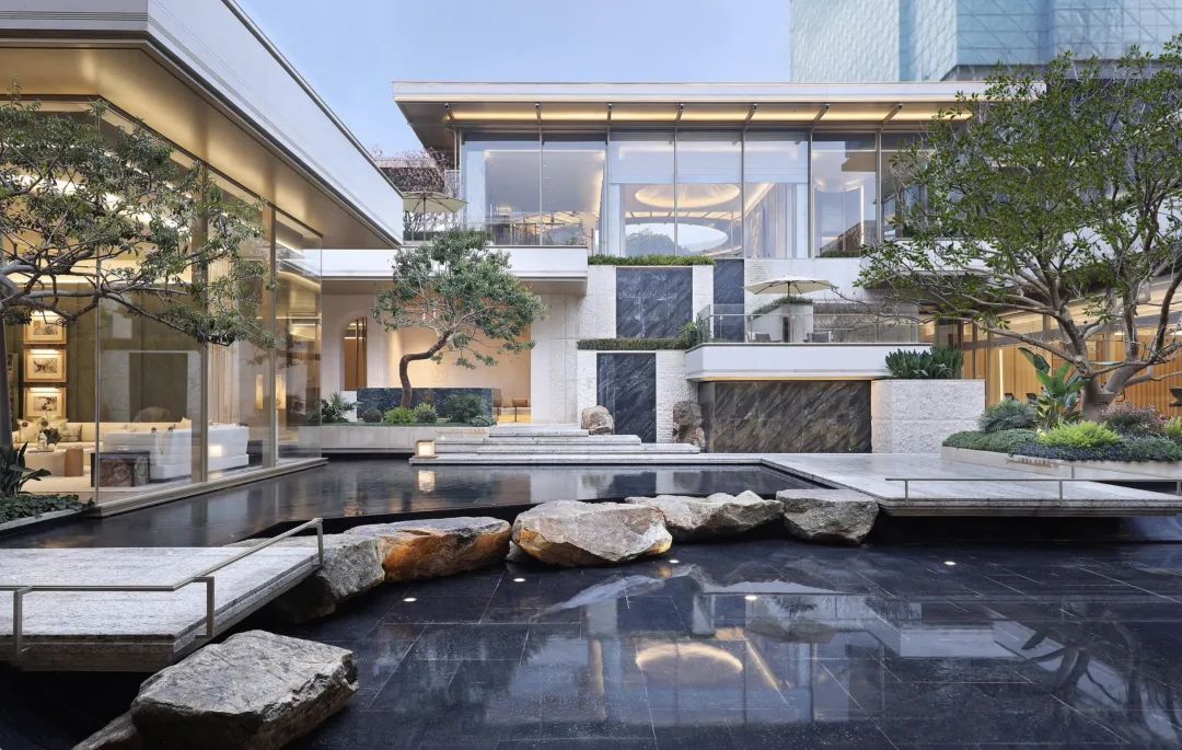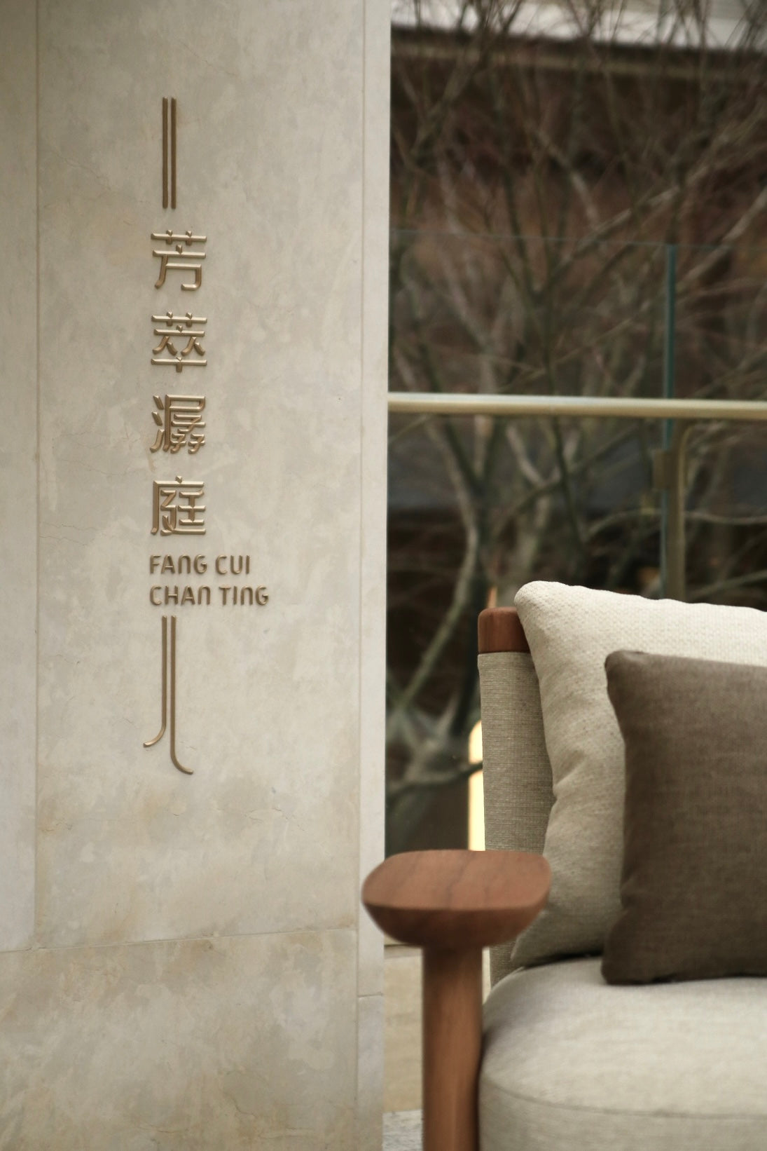 芳萃潺庭所在的和萃揽悦园整体由白色与金色为主调,近百年的桂花和环型的门厅,下沉式的庭院布局,是现代简约与中式审美的结合,古朴简约的环境中带着低调的奢华。